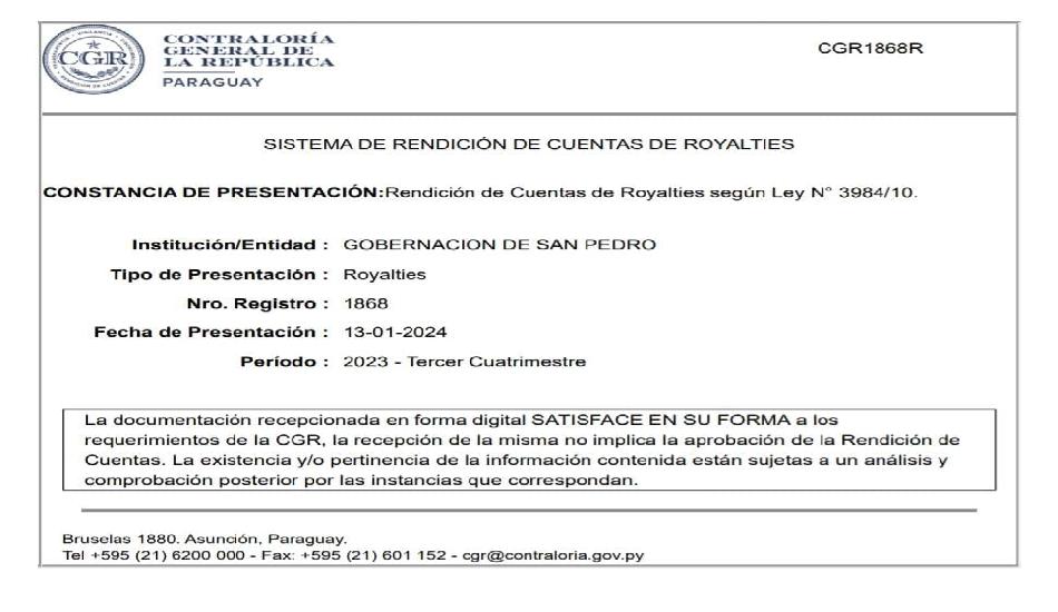 Hemos presentado en tiempo y forma, sin ninguna observación, también aprobado nuestra rendición de los recursos de ROYALTIES a la Contraloría General de la República, honrando la confianza puesta en esta administración.
